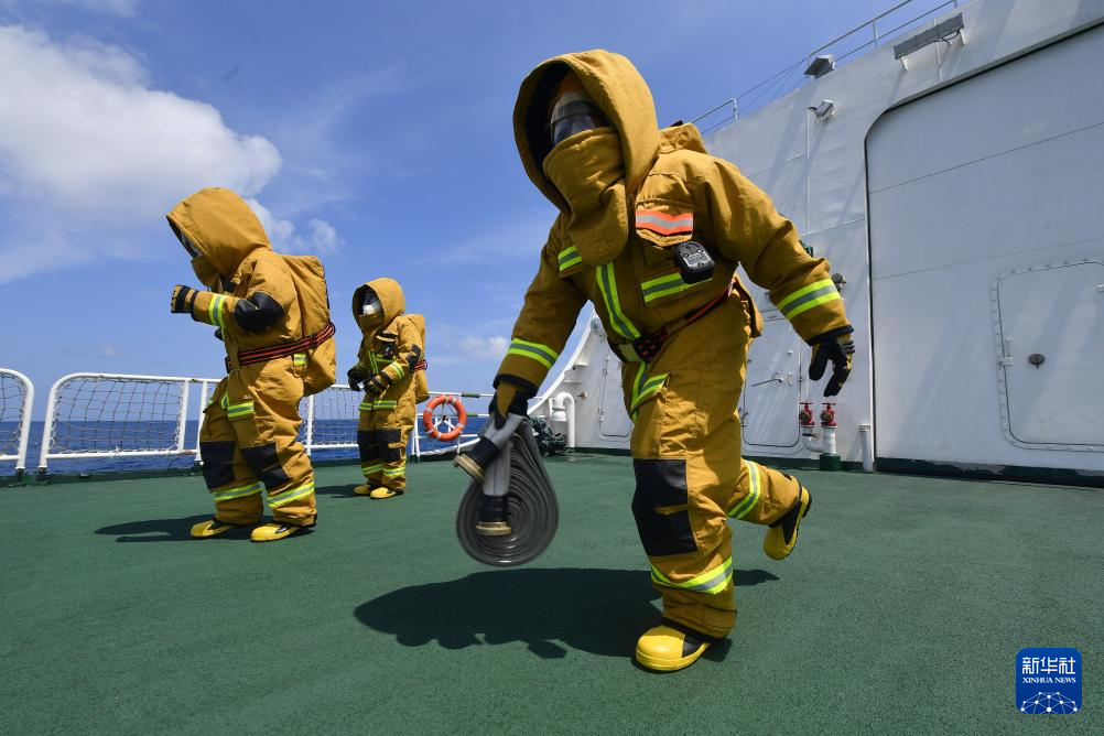 茫茫南海,壮阔浩渺,深蓝色的海水拍打着海警舰艇。连日来,海警三都舰编队在我国南海某海域执行巡航值守任务,维护祖国海洋权益。中国海警执法员开展常态巡逻执法、组织日常训练、管理服务过往船舶等工作。