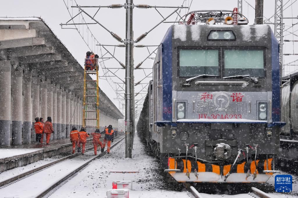 3月11日,在乌鲁木齐西站,乌鲁木齐供电段接触网工在雪中检修接触网。