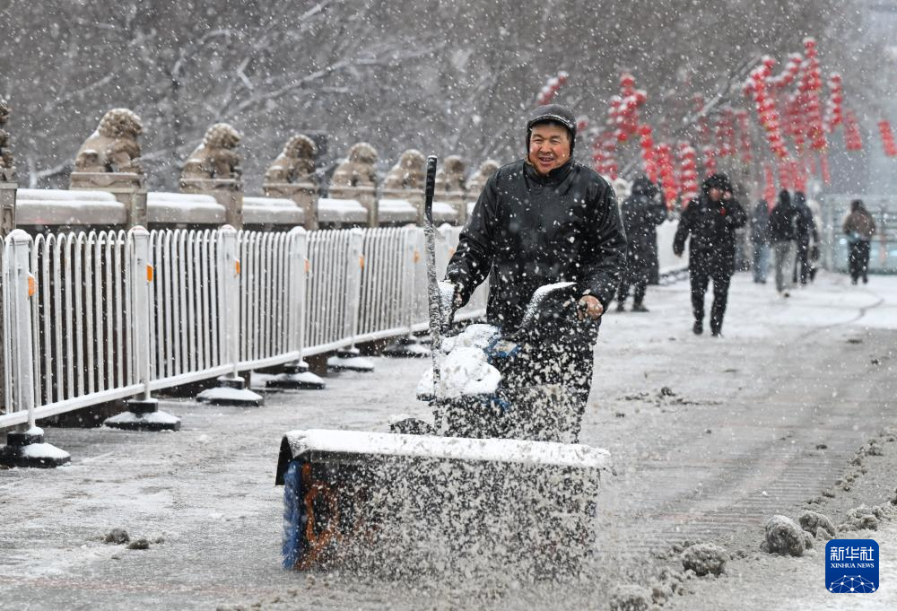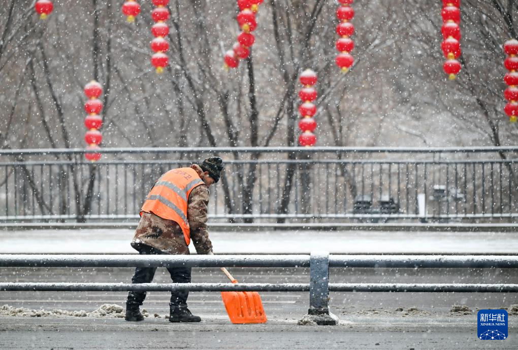 3月11日,环卫公司工作人员在新疆乌鲁木齐市西大桥附近清理积雪。