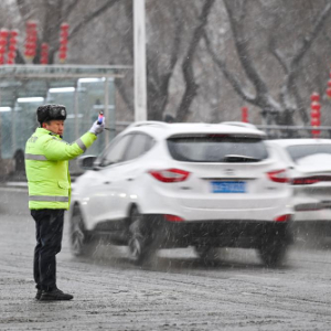 3月11日,乌鲁木齐市公安局交通管理支队天山区大队民警在西大桥路口引导车辆通行。