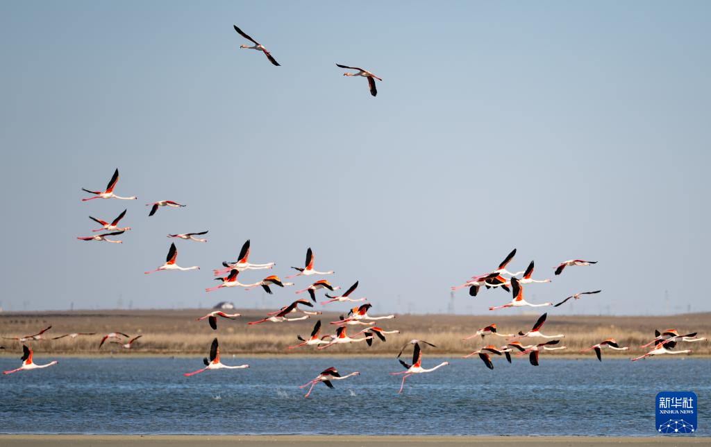 3月10日,在哈萨克斯坦曼格斯套州阿克套市郊,火烈鸟在卡拉科尔湖飞翔。