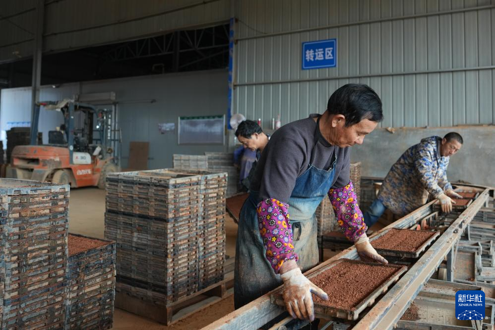 3月12日,在岳阳市汨罗县罗江镇,农民在育秧大棚内摆放早稻秧盘。