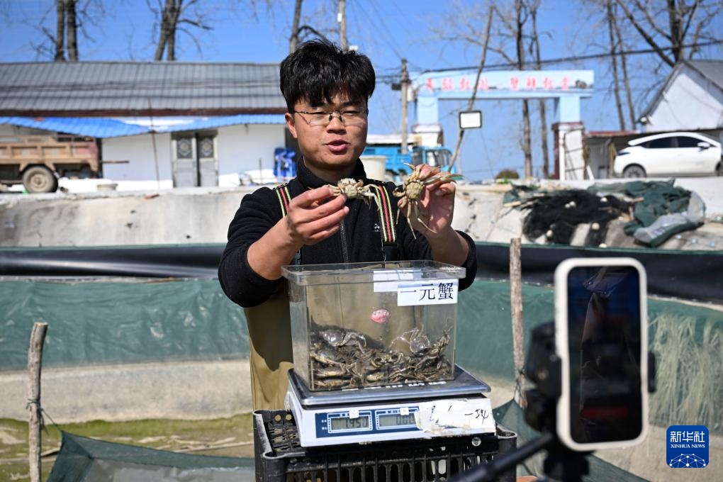 3月13日,在蚌埠市五河县申集镇黄李村的螃蟹养殖基地,朱彩胜在短视频平台和网友互动。