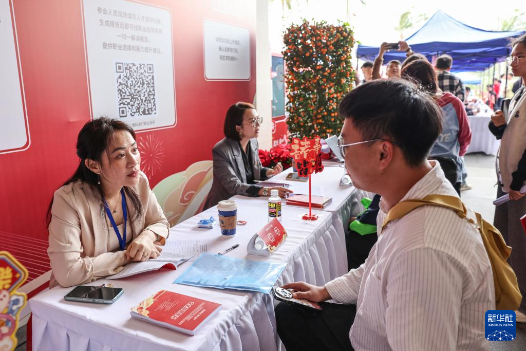 3月13日,在海口市2026年春节返乡高校大学生与青年人才专场招聘会现场,求职者与参会企业招聘代表洽谈。
