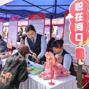 3月13日,在海口市2026年春节返乡高校大学生与青年人才专场招聘会现场,求职者在职业指导区了解就业政策。