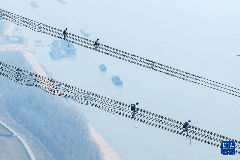 在安徽省铜陵市枞阳县长江边,安徽送变电工程有限公司检修人员在300多米高空进行检修作业(3月10日摄,无人机照片)。近日,我国“西电东送”重要通道——±800千伏特高压金塘线启动全面检修。
