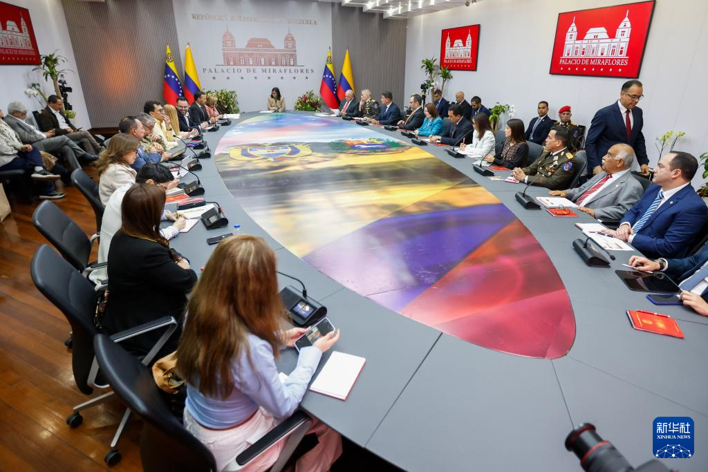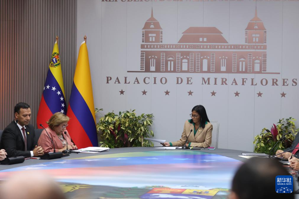 3月13日,委内瑞拉代总统德尔西·罗德里格斯(中)在位于加拉加斯的总统府与哥伦比亚代表团举行会晤。
