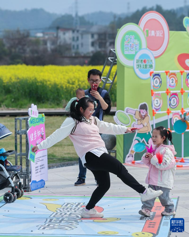 3月15日,游客在建德市更楼街道城南城市田园油菜花田边的消费市集玩游戏。