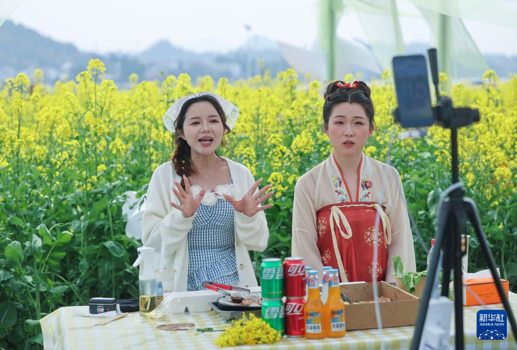 3月15日,主播在建德市更楼街道城南城市田园油菜花田里直播。