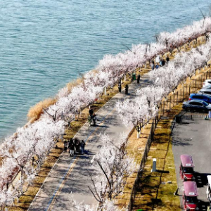 3月16日,游客在河北省石家庄市滹沱河畔赏花游玩(无人机照片)。