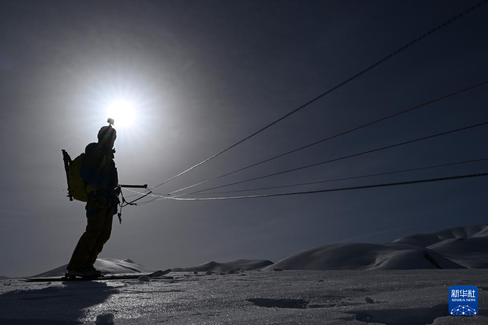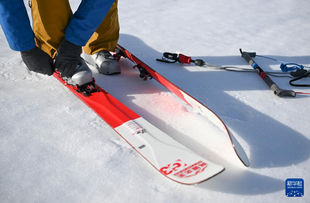 滑行前,程鹏将雪崩信标装进贴身口袋,便于遇险时第一时间施救(3月15日摄)。
