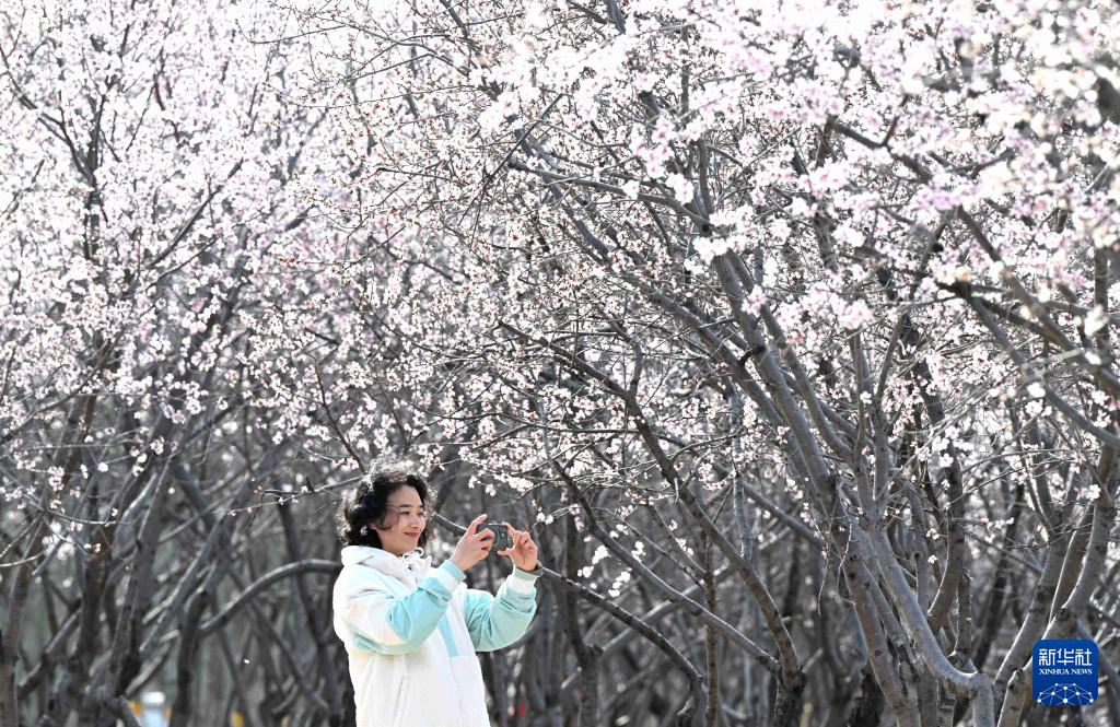 3月18日,游人在河北省石家庄市桥西区环城水系绿地拍摄山桃花。