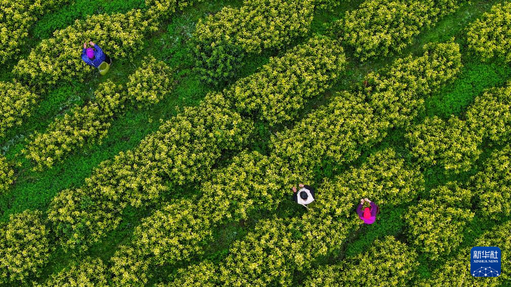 3月19日,茶农在贵州省铜仁市江口县坝盘镇挂扣村生态茶园采摘黄金芽春茶(无人机照片)。