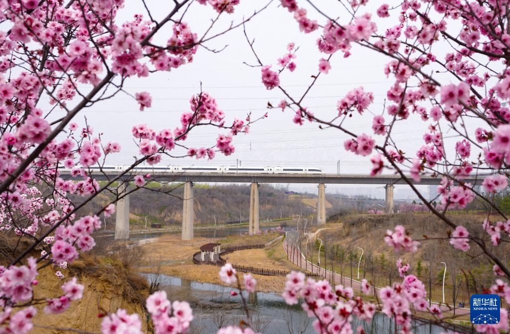 3月19日,一列高铁列车驶过路边开满鲜花的徐兰高速铁路郑州段。