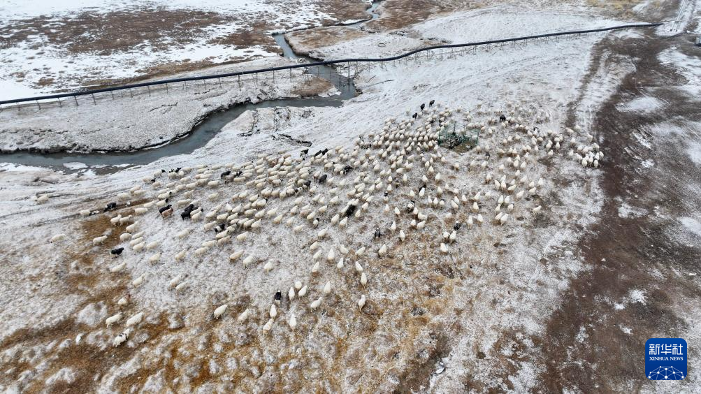 3月18日,在甘肃省阿克塞哈萨克族自治县阿勒腾乡哈尔腾村,羊群在哈尔腾河周边觅食(无人机照片)。