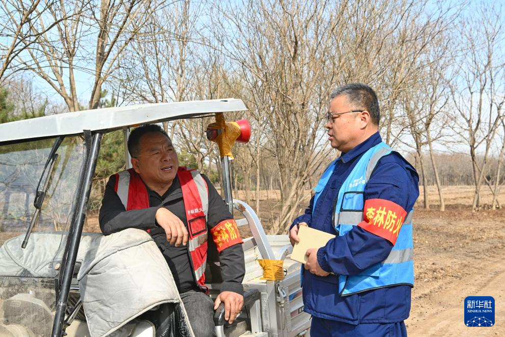 3月19日,刘世光(左)在雄安新区“千年秀林”雄中片区防火检查站与护林网格员交流。