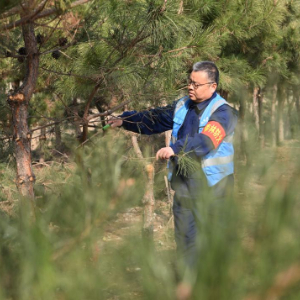 3月19日,刘世光在雄安新区“千年秀林”雄中片区的树林里查看病虫害情况。