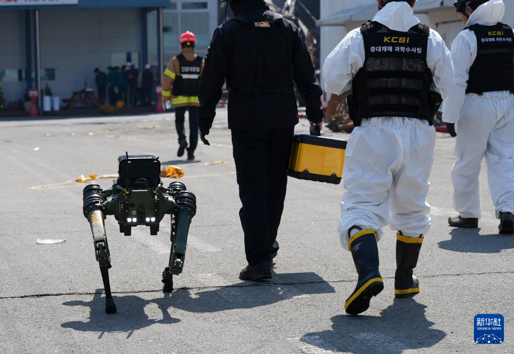 3月21日,救援人员和救援机器狗抵达韩国大田工厂火灾现场,参与搜救行动。