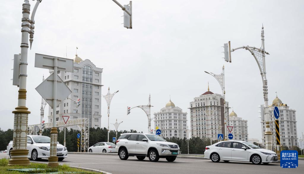 3月16日,车辆行驶在土库曼斯坦首都阿什哈巴德街头。