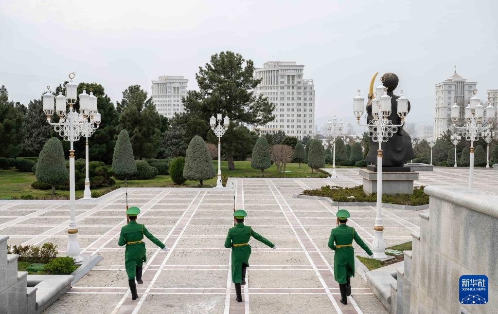 这是3月16日在土库曼斯坦首都阿什哈巴德的独立柱附近拍摄的礼兵。