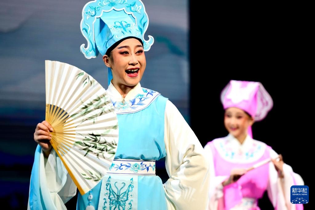 3月20日,在博兴县市民文化中心,来自云南省大理白族自治州白剧团的戏曲演员在表演白剧《柳荫记·十八相送》。