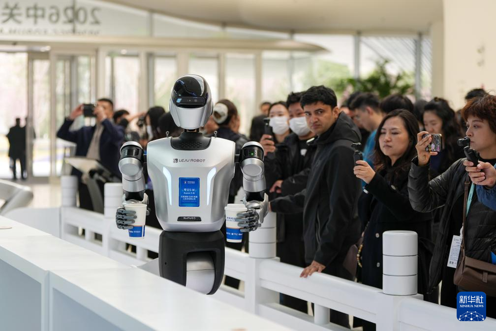 3月24日,在中关村国际创新中心的机器人餐吧,机器人在端送饮品。