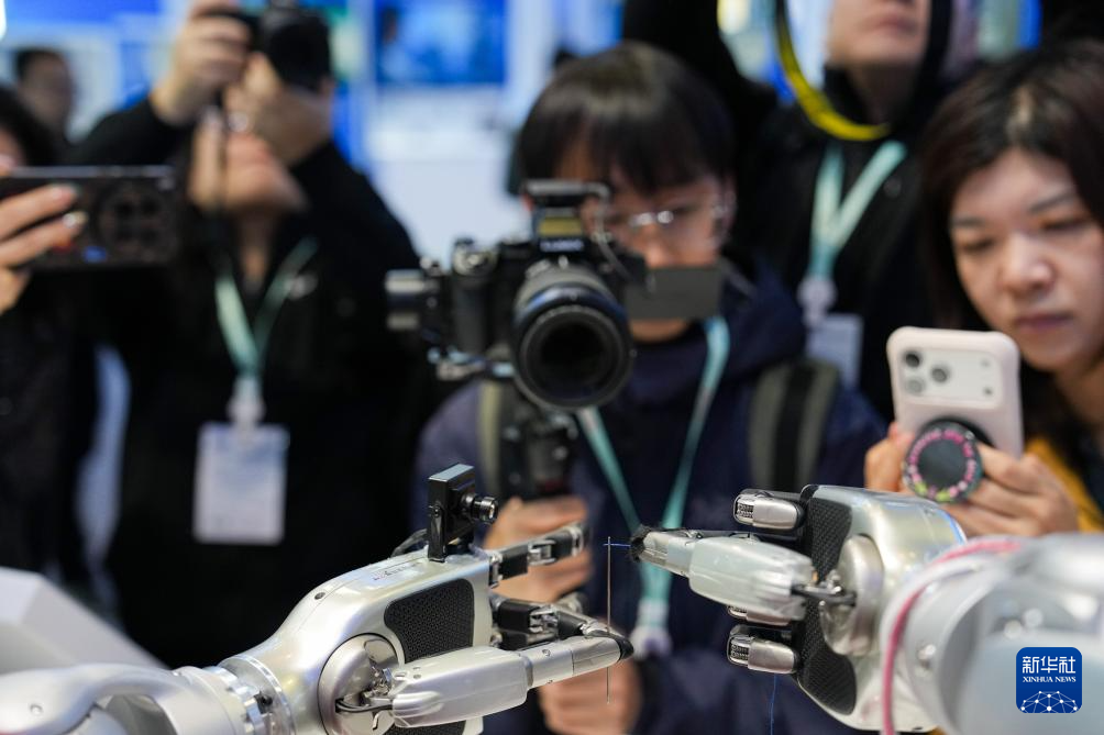 3月24日,在中关村展示中心常设展上,一台配备了灵巧手的机器人展示穿针引线。
