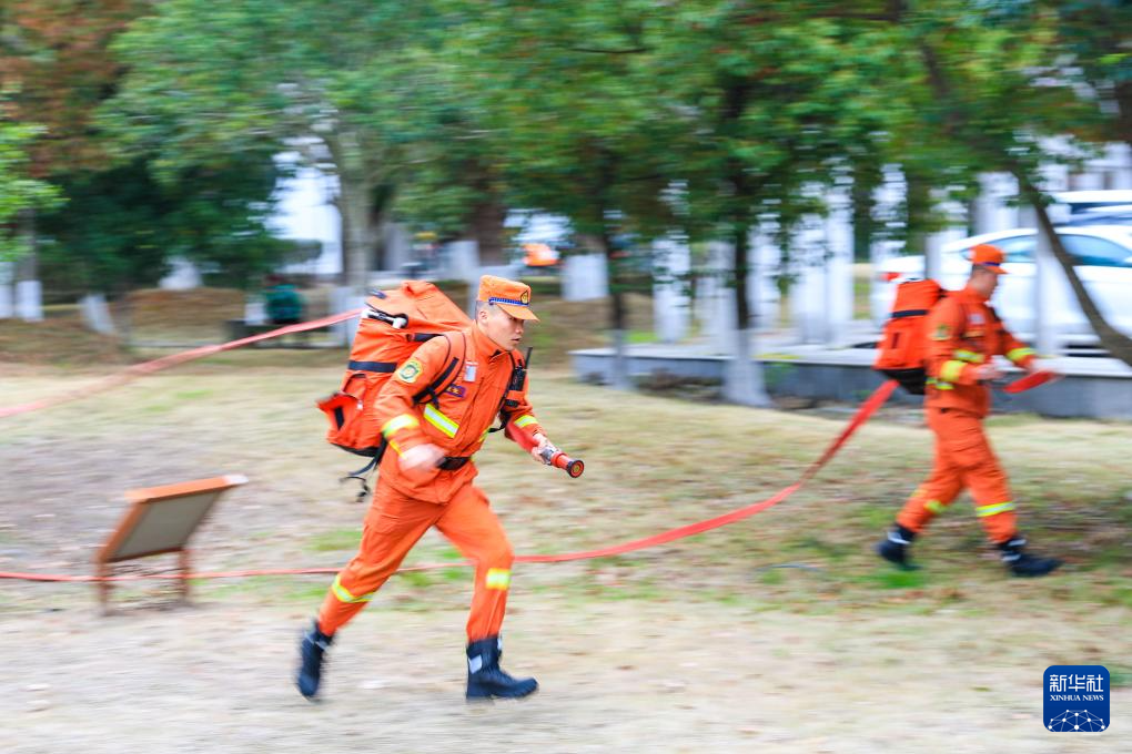 3月24日,在浙江省宁波市鄞州区,当地综合森林火灾应急救援队队员使用移动水泵进行灭火演练。