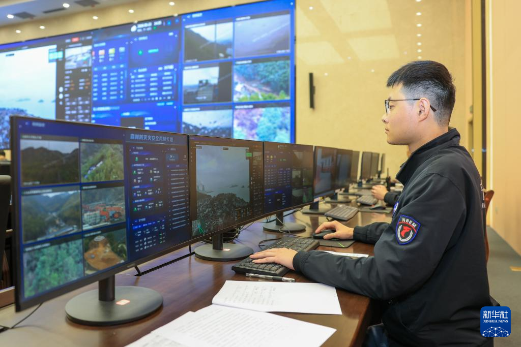 3月23日,在浙江省宁波市城市安全运行中心,工作人员使用“森林防灭火系统”实时监测森林火险情况。