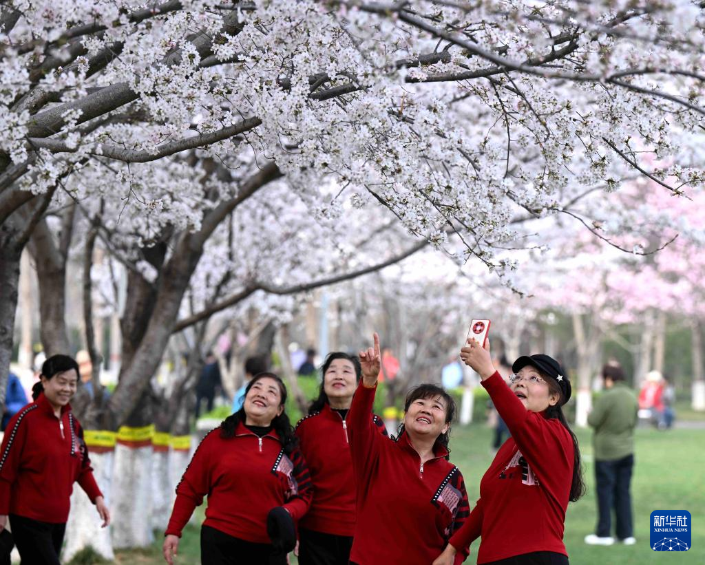 3月26日,游人在河北省石家庄市石津灌渠文化公园赏花拍照。