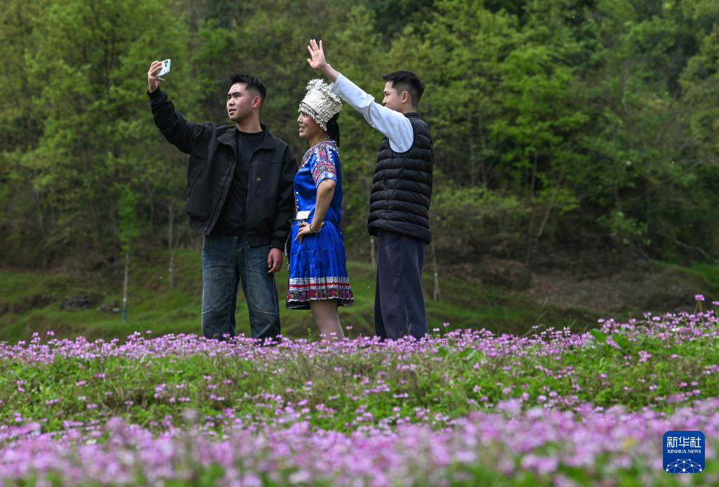 3月26日,在重庆市武隆区石桥苗族土家族乡八角村,游客与当地村民在紫云英花海中合影。