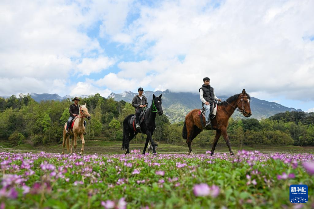 3月26日,在重庆市武隆区石桥苗族土家族乡八角村,游客在紫云英花海中骑马。