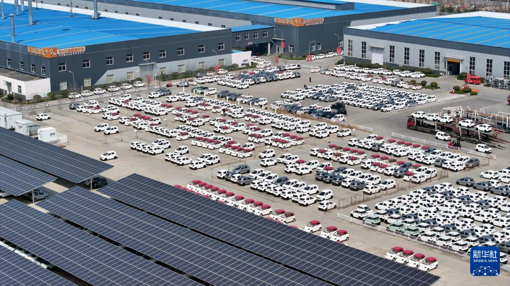 3月26日,在日照市五莲县一家企业,下线的新能源汽车停放在厂区广场(无人机照片)。