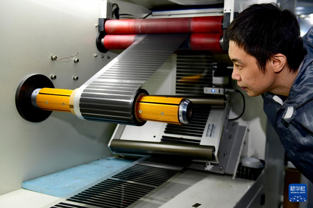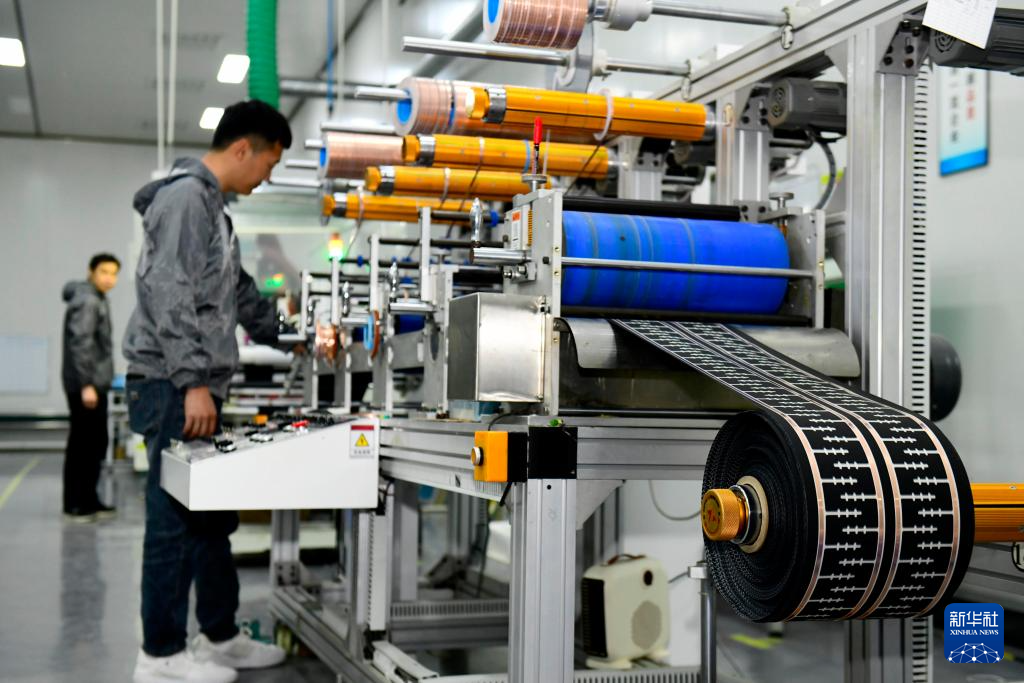 3月26日,在日照市五莲县一家企业,工作人员在加工纳米发热面料。