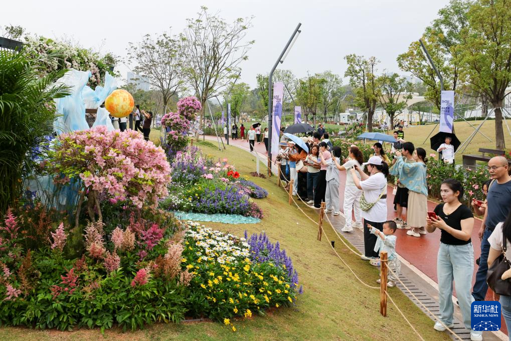 3月27日,游客在2026粤港澳大湾区花展现场拍照留念。