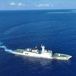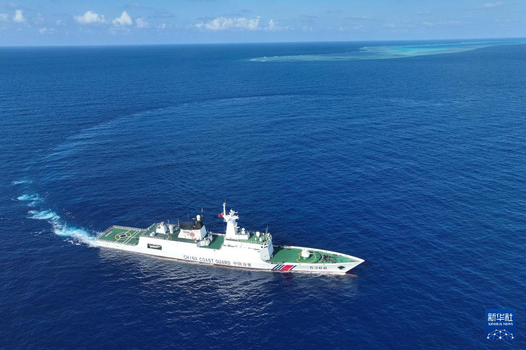 3月24日,海警三都舰在南海某海礁周边巡逻(无人机照片)。