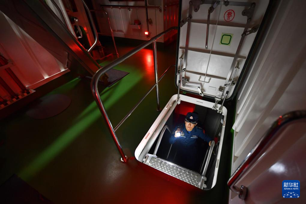 3月8日,海警三都舰执法员在巡舱检查。