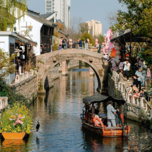 3月28日,在青浦区蟠龙新天地,市民游客在赏景游玩。