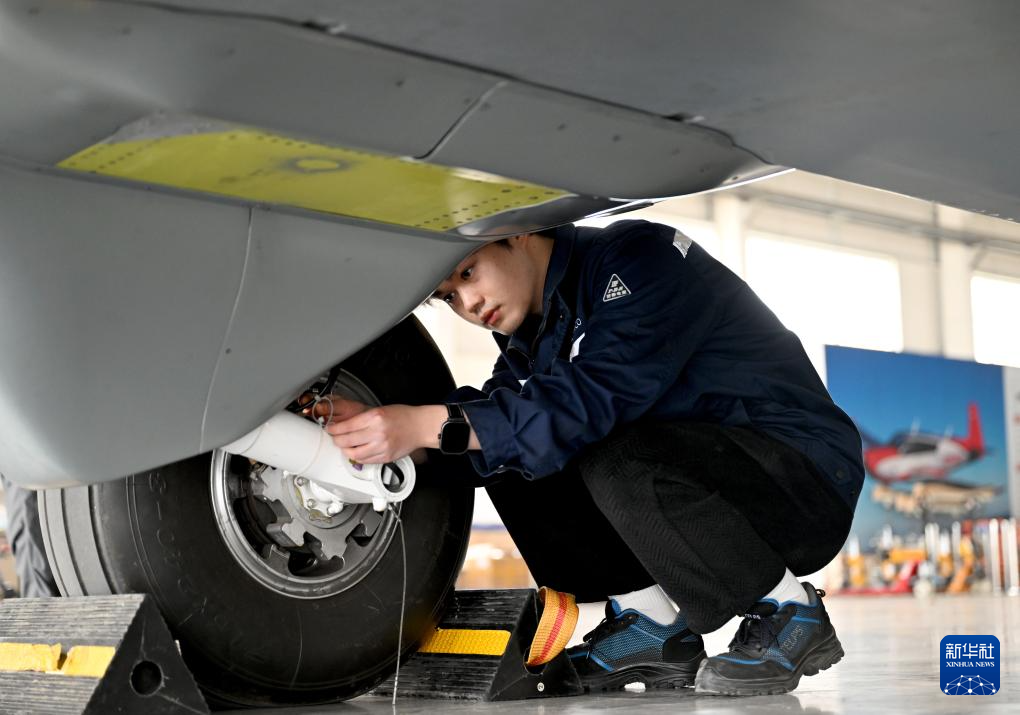 3月30日,在河南郑州上街机场,工作人员在试飞前检查运投无人机长鹰-8轮胎。