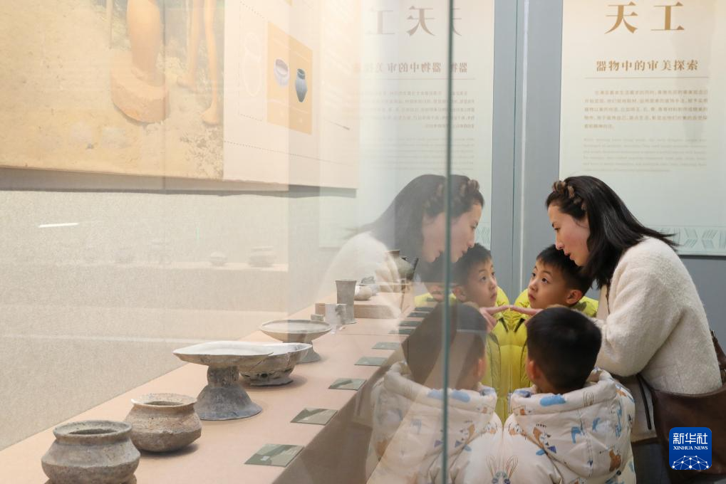 家长和小朋友在“江海起源 文明之光——青墩遗址出土文物‘回乡’展”欣赏展品(2026年2月7日摄)。