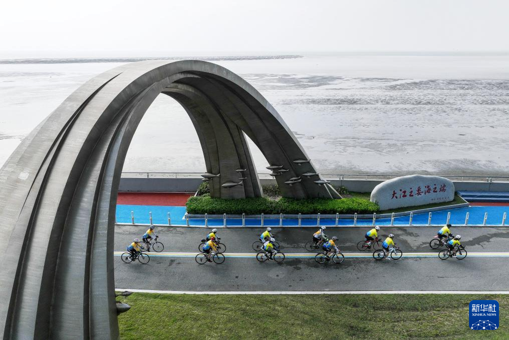 骑行爱好者在江苏启东江海文化景观大道骑行(无人机照片,2023年9月17日摄)。