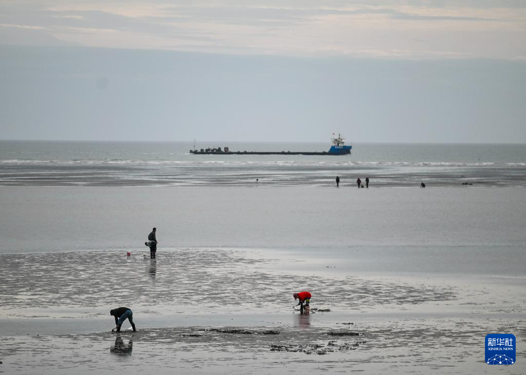 人们在江苏启东圆陀角旅游度假区滩涂上赶海(2024年11月9日摄)。