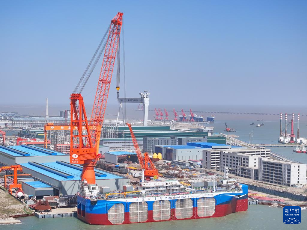 在南通通州湾高端装备临港产业园下水的漂浮式动力定位全域化网箱型工船“湛江湾一号”(无人机照片,2025年4月14日摄)。