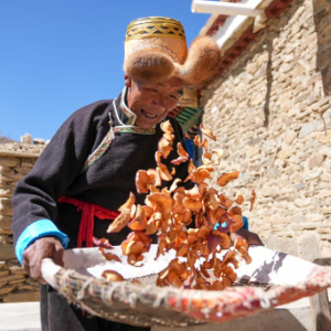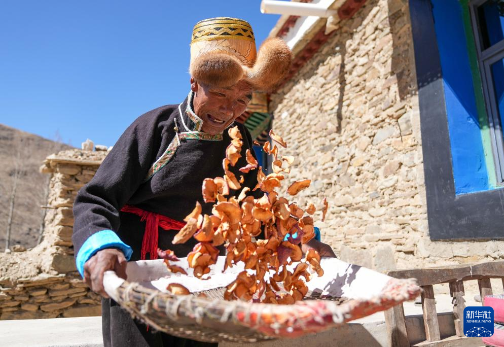 白玛扎西在家中翻晒苹果干(3月26日摄)。