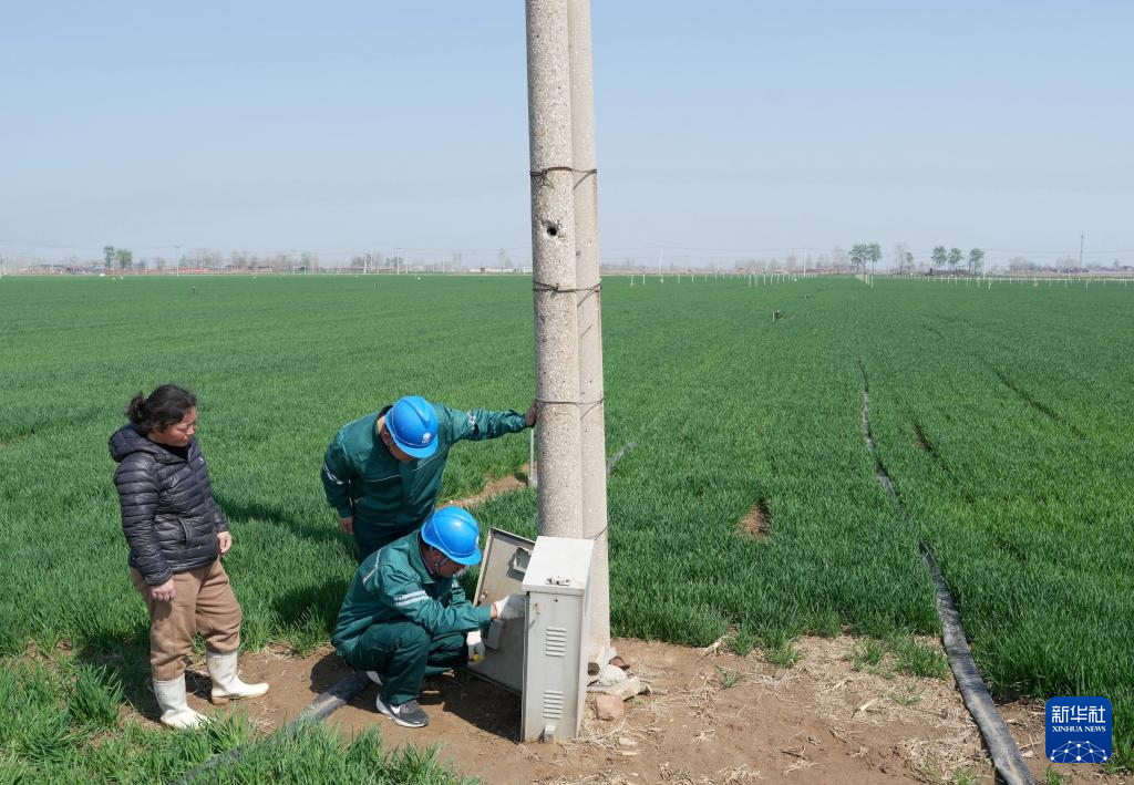 3月31日,国网正定县供电公司的工人在河北省正定县新安镇西慈亭村田间帮助村民检修农灌电力设备。