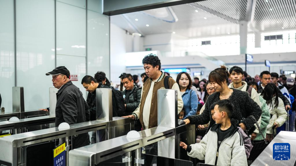 4月1日,旅客在六盘水火车站南站房排队验票乘车。