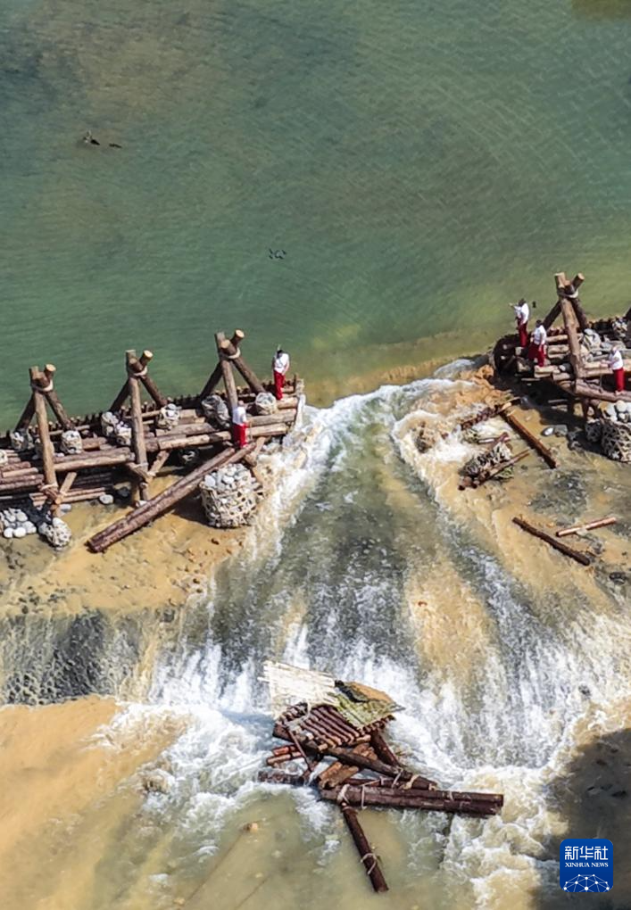 4月3日,在2026都江堰放水大典上,堰工砍断杩槎的绳索后,岷江水奔流而下(无人机照片)。