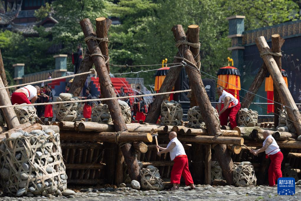 4月3日,在2026都江堰放水大典上,堰工举起利斧砍断杩槎,岷江水奔流而下。