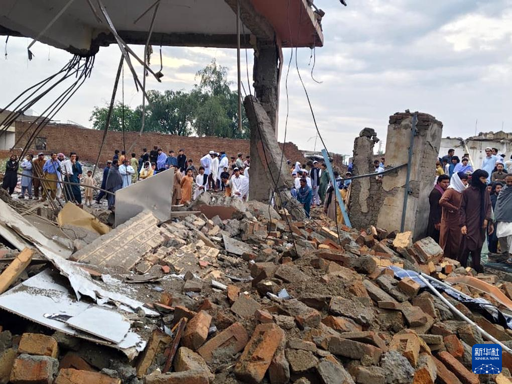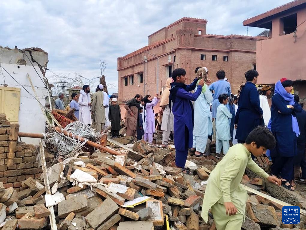 4月3日,在巴基斯坦西北部开伯尔-普什图省本努地区,人们聚集在一座损毁的建筑旁(手机照片)。