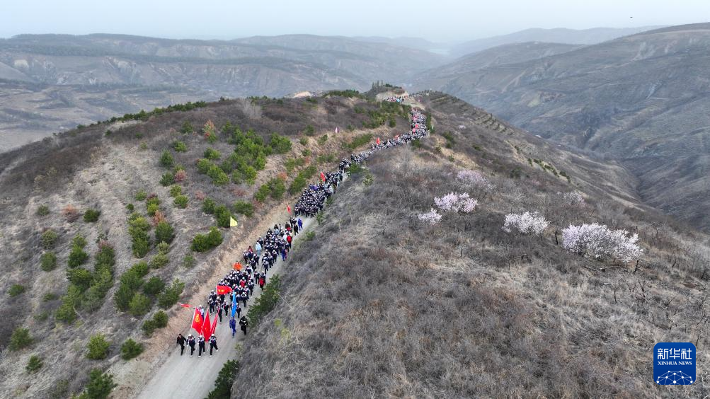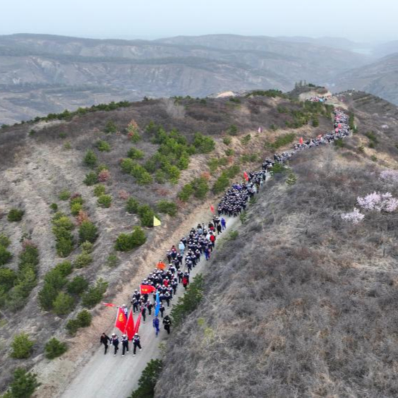 4月3日,参加徒步祭英烈活动的师生翻越黄峁山(无人机照片)。